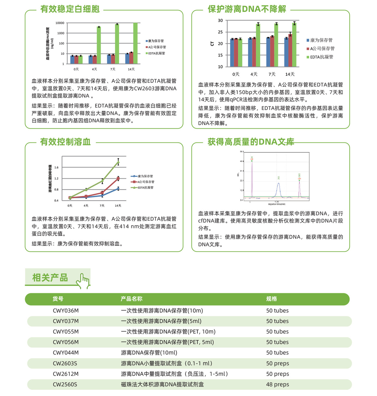 抑制核酸酶降解游离DNA,在4-37℃条件下可保存血液中的游离DNA长达14天。