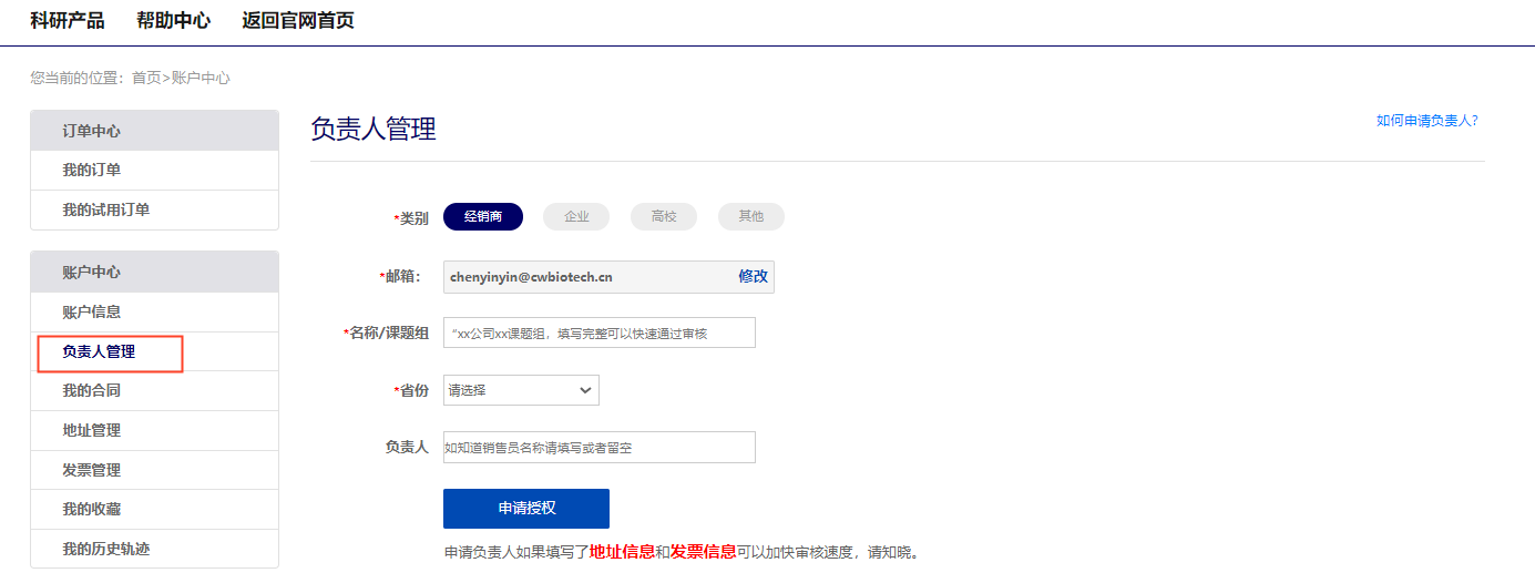 1.如果您有负责的销售对接,您可通过【会员中心】下【负责人管理】申请下单授权。